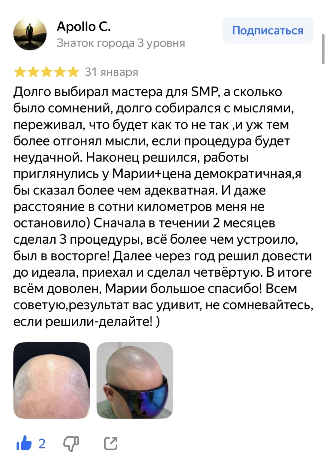Меня зовут Мария, я владелец студии трихопигментации в Санкт-Петербурге и уже 8–10 лет профессионально занимаюсь SMP (трихопигментацией кожи головы). Если коротко — я помогаю визуально вернуть плотность волос там, где есть облысение, залысины, поредение или следы после пересадки. Трихопигментация — это не пересадка и не операция. Это точечная работа пигментом, которая создаёт эффект коротко стриженных, натуральных волос. Вблизи результат выглядит аккуратно и естественно. С ЧЕМ ЧАЩЕ ВСЕГО ПРИХОДЯТ: ✔ залысины и андрогенетическое облысение ✔ редкие волосы, «просвечивает» кожа ✔ маскировка рубцов и зон после пересадки ✔ желание аккуратной линии роста без хирургии КАК Я РАБОТАЮ: — сначала консультация и оценка зоны — подбираю оттенок под ваш тип кожи и волос — делаем разметку — работа проходит поэтапно (обычно 1–3 сеанса) — после — рекомендации по уходу Я работаю аккуратно и без шаблонов — результат подбирается под конкретную голову, форму, цвет и запрос клиента. FAQ ❓ Это навсегда? Нет. Пигмент со временем постепенно светлеет. Обычно результат держится несколько лет, затем делается обновление. ❓ Сколько нужно сеансов? В среднем 2-3 сеанса, в зависимости от зоны и желаемой плотности. ❓ Это больно? Ощущения индивидуальные, но процедура переносится спокойно, без жёсткой боли. ❓ Подходит ли после пересадки волос? Да. Часто делают для маскировки рубцов и усиления визуальной плотности. ❓ Это выглядит натурально? Да, если работа сделана правильно — именно на это я делаю упор.
