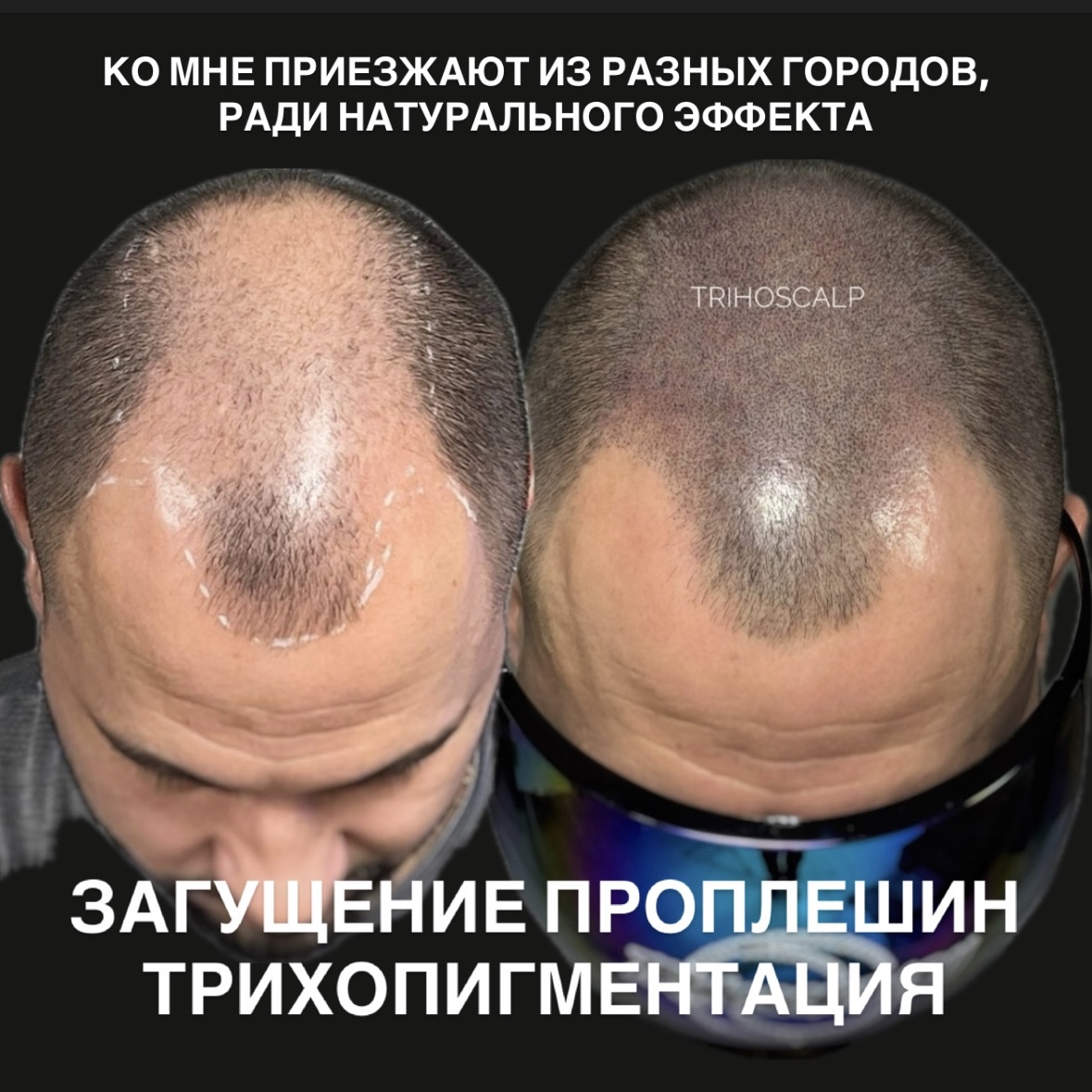 Меня зовут Мария, я владелец студии трихопигментации в Санкт-Петербурге имя которому TRIHOSCALP и уже 8–10 лет профессионально занимаюсь SMP (трихопигментацией кожи головы) c 2017 года так то, в теме давно так что задавайте вопросы у мастера ветерана! Про регалии свои писать не буду я человек простой, но знайте я отвечаю за свои слова так как профи. PS надеюсь этот форум вообще еще живой.... Ну что, друзья, давайте я вам расскажу про трихопигментацию, честно и без страшилок, которые вы наверняка уже читали в интернете и чуть не упали в обморок. Трихопигментация или SMP — это когда мастер точечно «вкладывает» пигмент в кожу головы, чтобы создать видимость волос. То есть это не татуировка, не больно и волосы при этом не растут из кожи. Главное понять: трихо — это не про возвращение волос, это про камуфляж. Камуфляж тех самых сильно бросающихся в глаза лысин, про заполнение проплешин, про создание эффекта густоты там, где волосы есть, но их мало. Если у вас волос немного — закрыть одну проплешину легко. Если почти всё побрито — делаем «бритый эффект», восстанавливаем лобную линию, при необходимости подправляем после пересадок. И знаете, что круто? Когда вы смотрите наши работы, зажившие через года — под лампой всё выглядит естественно. Это реально не страшно и красиво, а эффект живой и аккуратный. Это не татушная процедура 20летней давности все уже давно стало современно емае за счет пигментов техники и прочих нюансов Мифы: — «Больно». Да чуть-чуть почесалось, не больше. — «Навсегда». Со временем тускнеет, всегда можно корректировать. — «Будет зелёная голова». Только если мастер полный профан. А теперь немного о выгодах, чтобы было понятно, зачем всё это: вы без проплешин, проплешины, лобная линия, а после пересадок результат реально дополняется и смотрится цельно. Думаете никто не делает и это кринжа неа я на этом построила студию это работает и еще как И да, смотрите мои работы — реальные, зажившие через годы, при свете лампы и естественно. Трихопигментация — это аккуратно, красиво, уверенно и работает на все случаи жизни, где волосы нужно «подправить» визуально могу писать оды этой процедуре но лучше смотрите сами https://msk.trihoscalp.ru/ https://trihoscalp.ru/ инста везде TRIHOSCALP всех жду всем скидки дам за промокод из форума И если решились идти к мастеру всегда спрашивайте зажившие фото спустя там месяц после курса полного или год два это показатель и чтоб не пизженные были работы часто тоже встречается